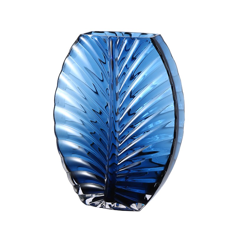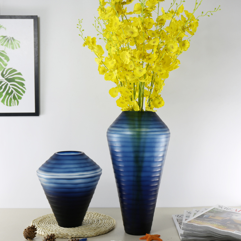 蓝色玻璃花瓶高i款 手工磨刻渐变插花器家用 玄关装饰品铜艺大摆