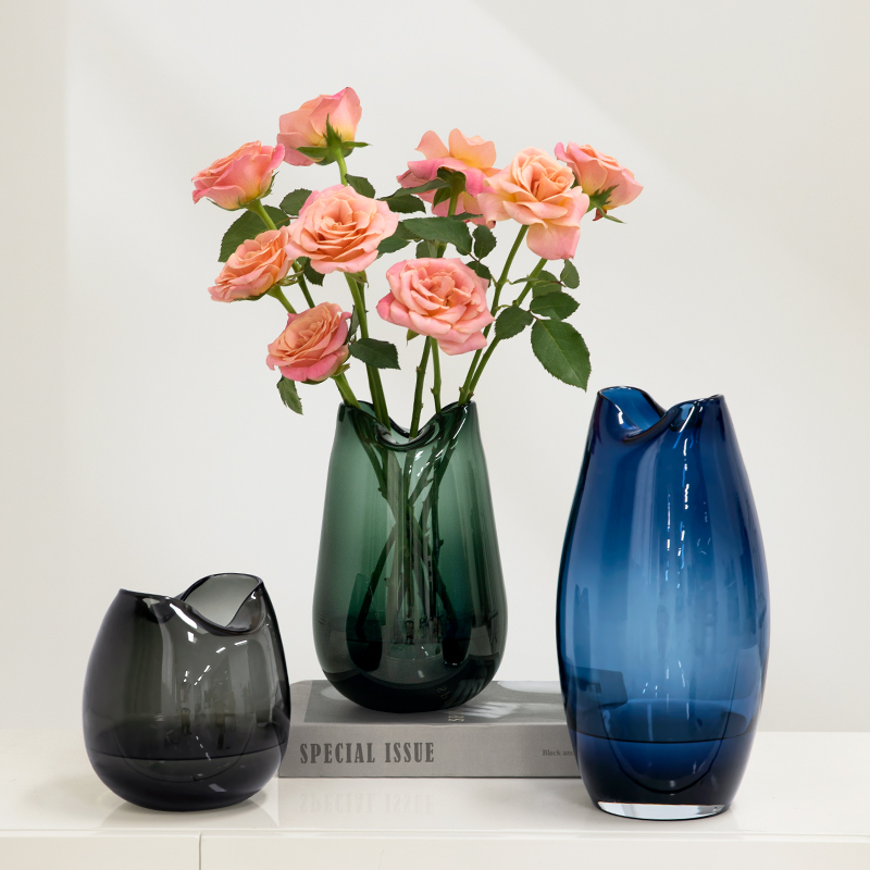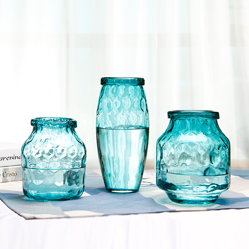新款现代北欧水花口蓝色玻璃花瓶水培鲜花器餐桌面家居装饰品摆件