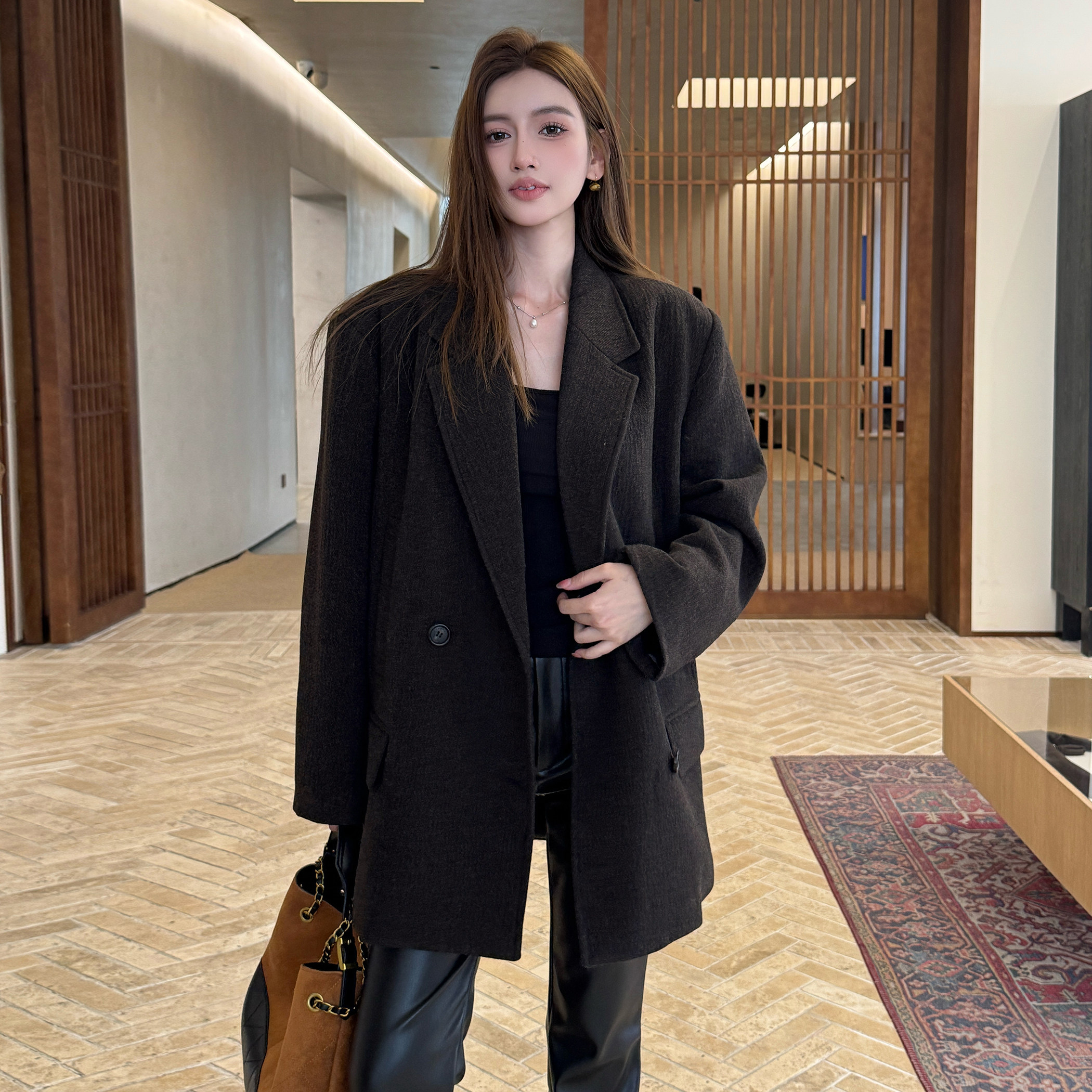 浅布调冬装加厚高级感羊毛呢西装大衣女复古双排扣显瘦中长款外套