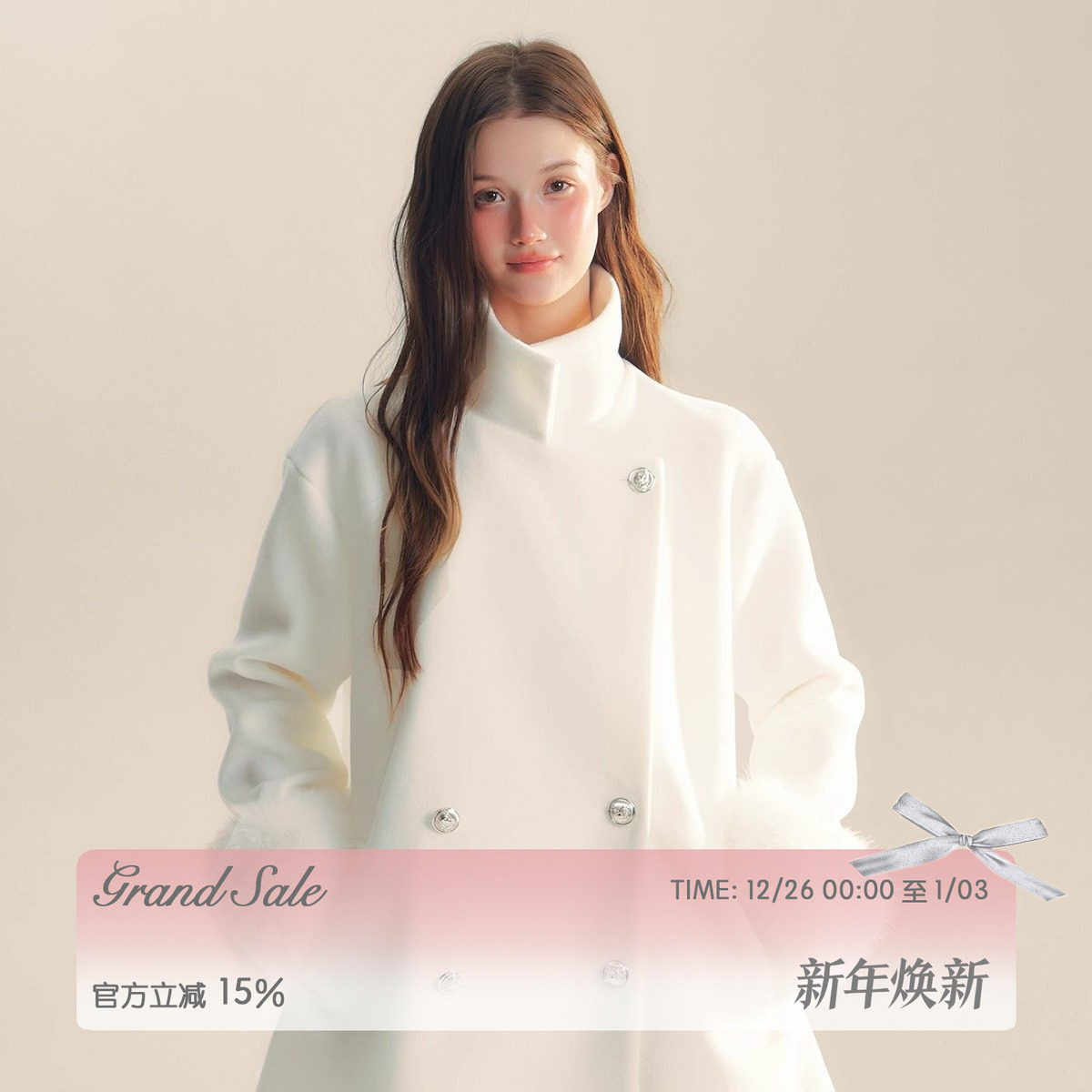RECIT 白色富家千金含羊毛大衣女冬装宽松高级感立领短款毛呢外套