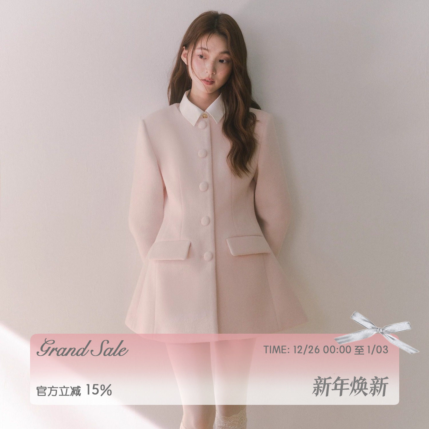 RECIT 嫩粉色千金风含羊毛大衣女冬装假两件衬衫领中短款毛呢外套