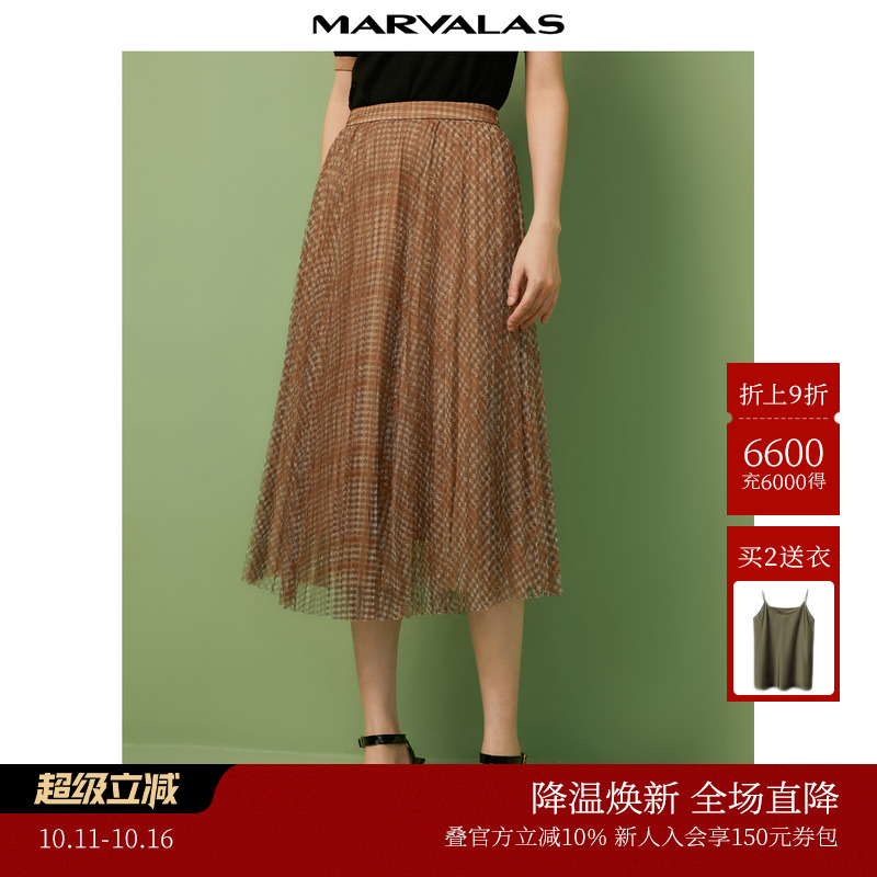 曼德诗纱裙女2025冬季新款格纹百褶半身裙雪纺中长款裙子a字裙