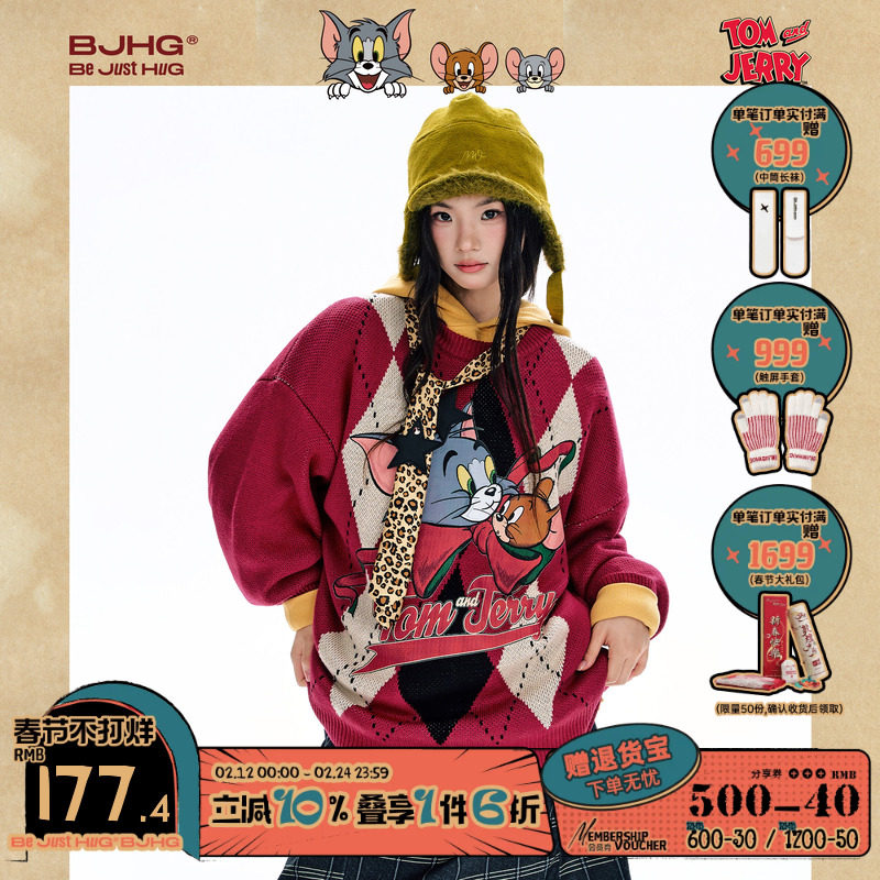 BJHG不计后果猫和老鼠联名圣诞毛衣男款冬季重磅菱格圆领针织衫女