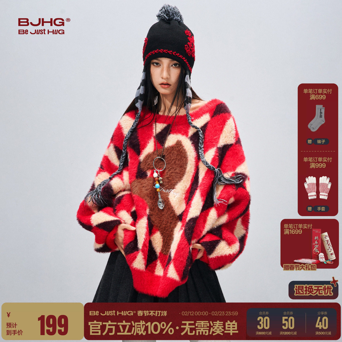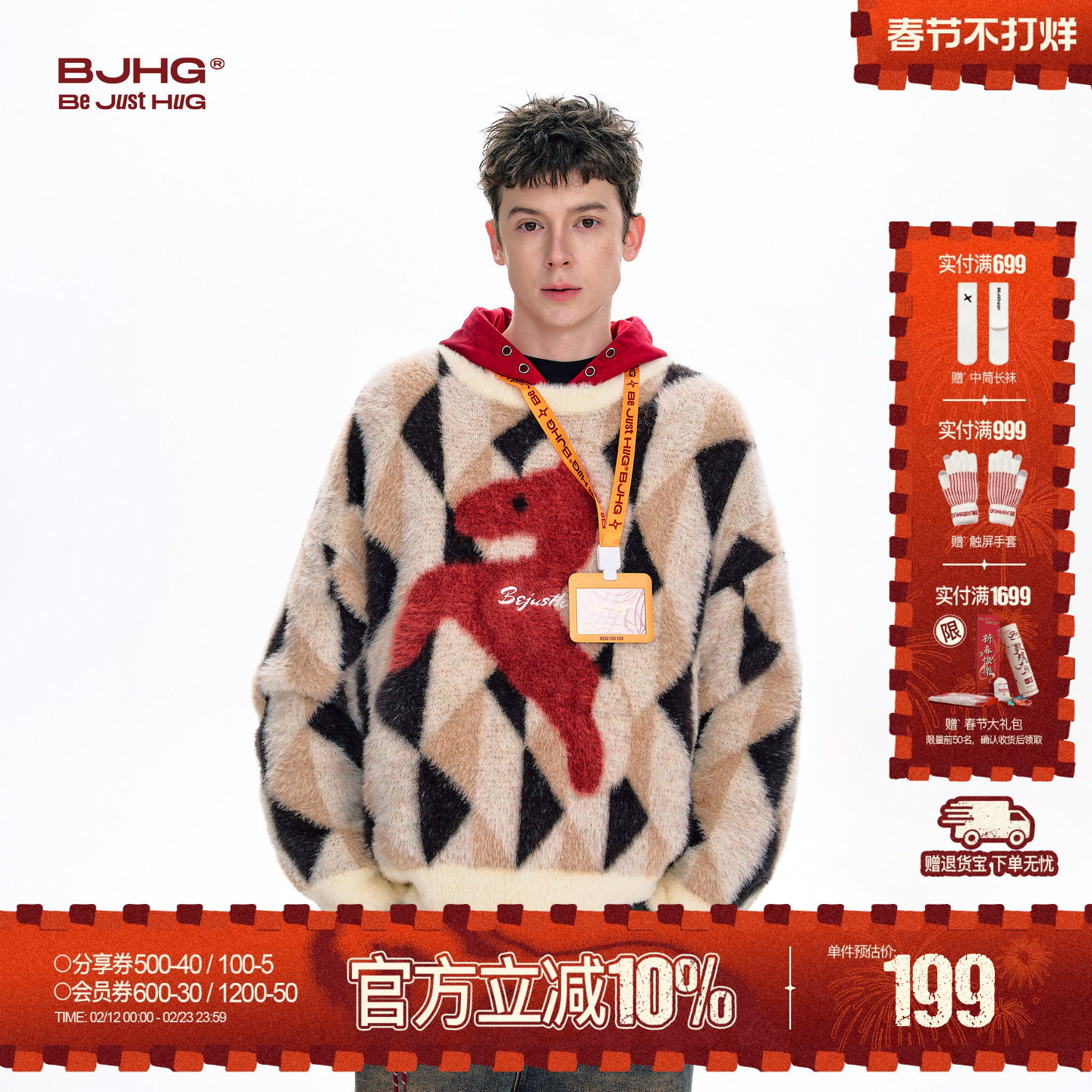 BJHG不计后果新年限定马年毛衣男款冬季红色撞色情侣装美式上衣女