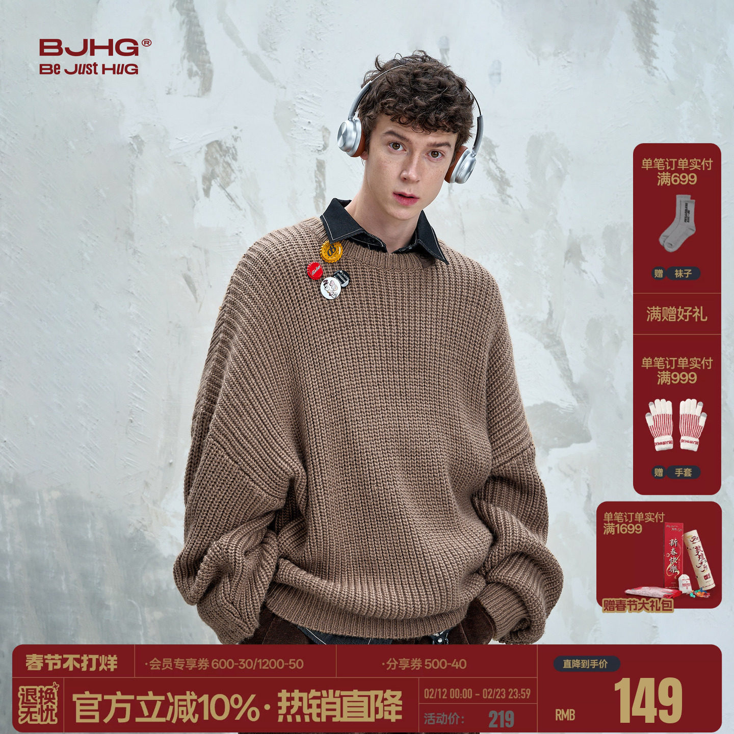 BJHG不计后果复古圆领毛衣男款冬季卫衣简约宽松针织衫情侣毛衣女