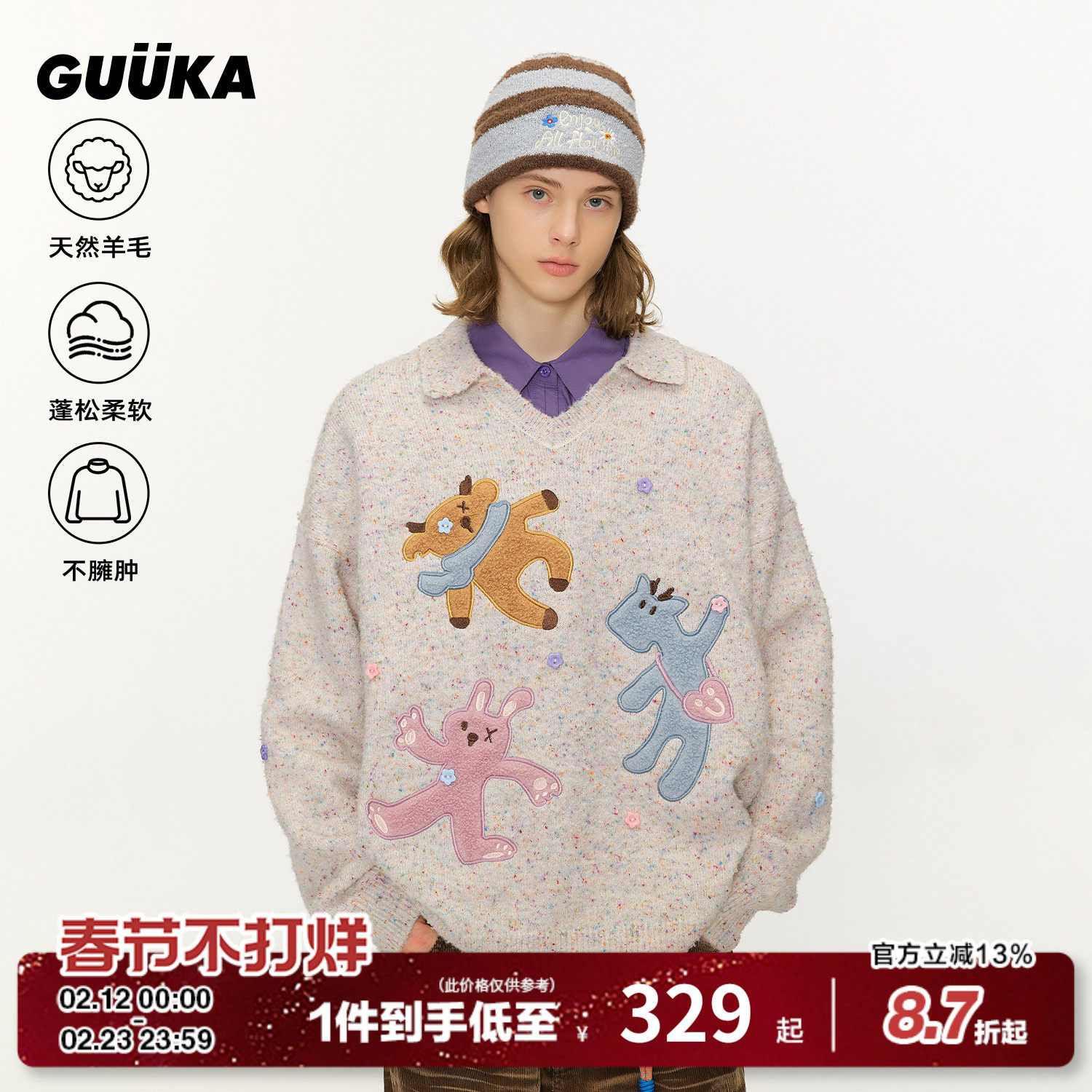 明星同款GUUKA潮牌刺绣V领针织毛衣男款冬季加厚星星纽扣绵羊毛衫