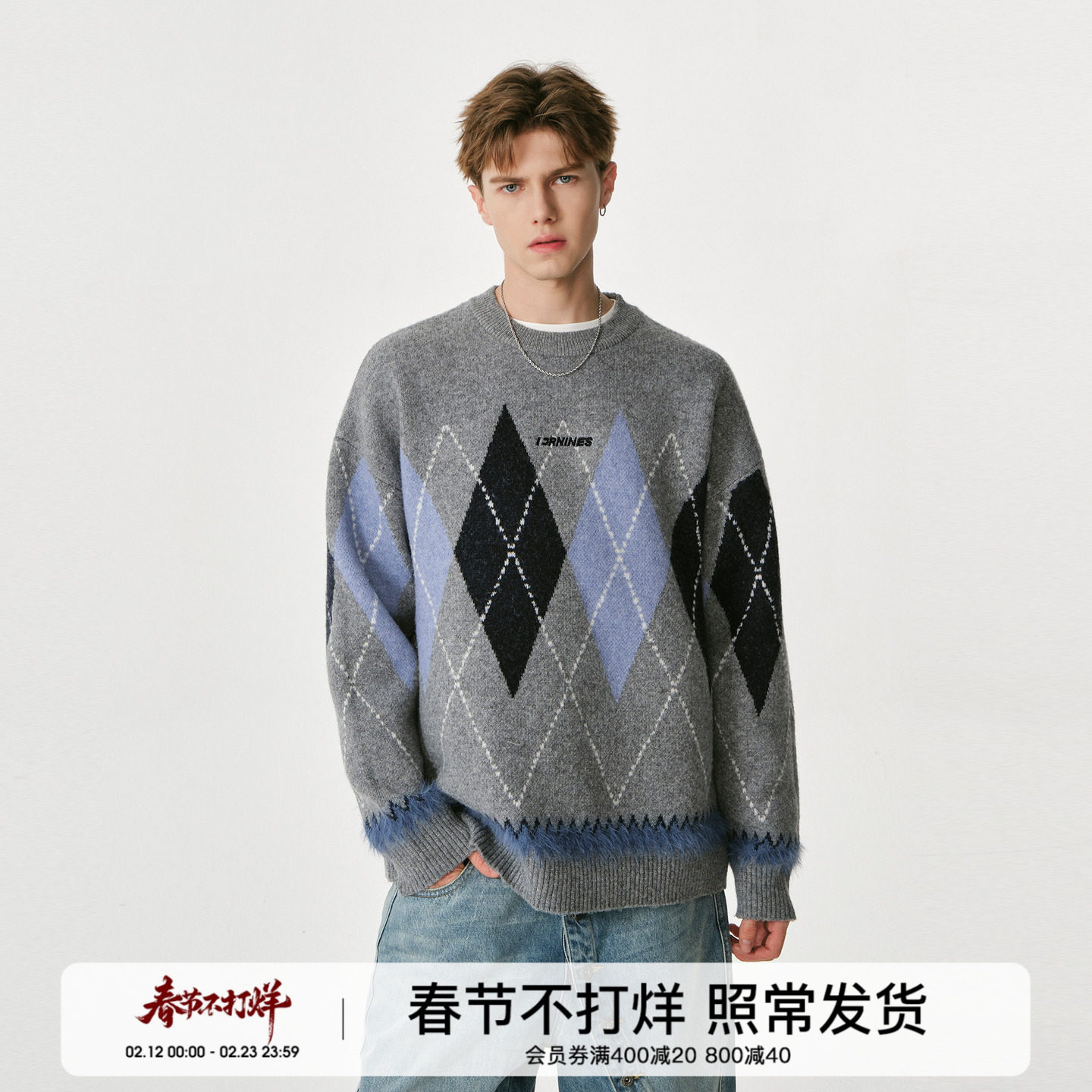 FORNINES含绵羊毛菱形格子毛衣男款秋冬季情侣毛线衣慵懒针织衫女