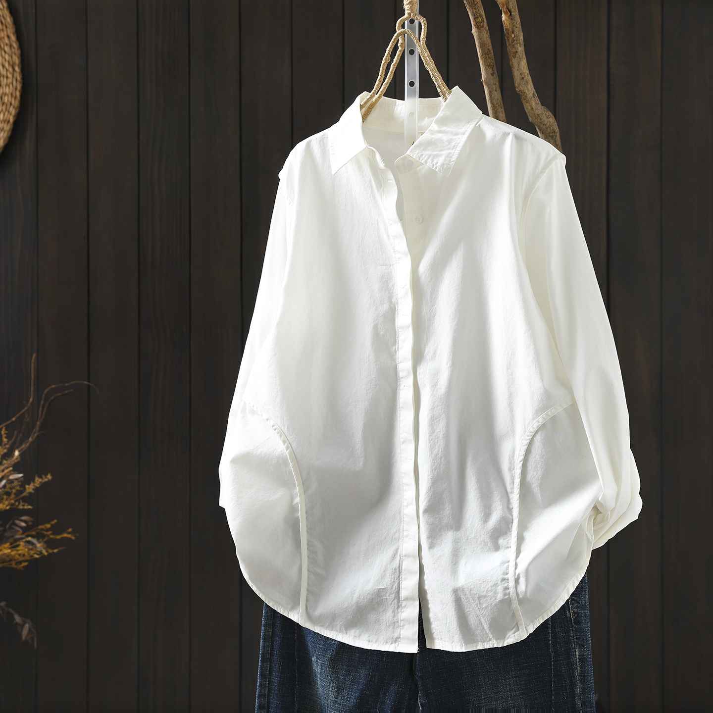 谷家 柔软舒适全棉白色衬衫女春秋 宽松棉麻风格上衣纯棉长袖衬衣