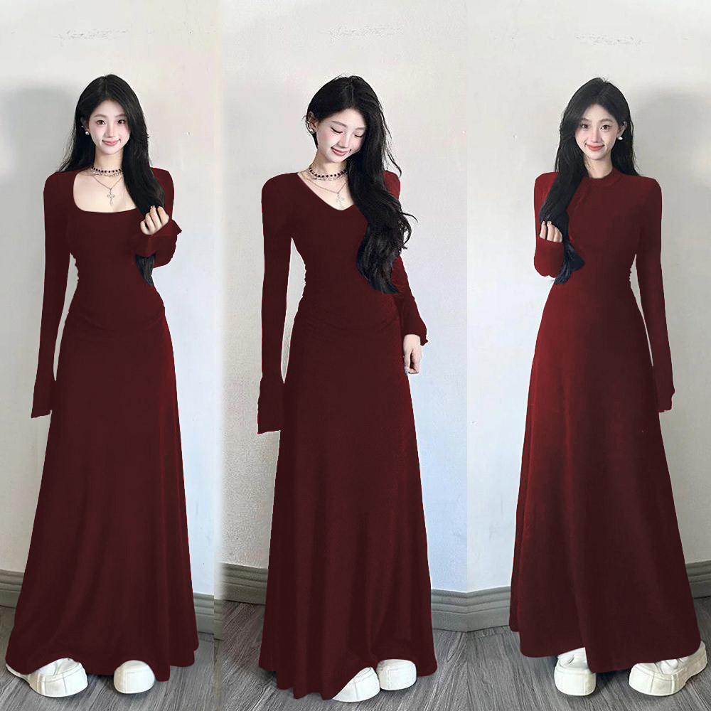 【圣诞新年战袍】安卡拉红2025秋冬修身长款连衣裙女收腰显瘦长裙
