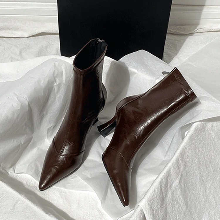 法式棕色尖头细跟马丁靴女2025秋冬新款百搭后拉链高跟鞋潮流短靴