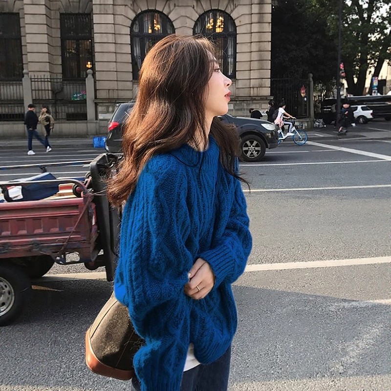 克莱因蓝复古麻花毛衣女秋冬季加厚外穿慵懒高级感宽松针织衫上衣