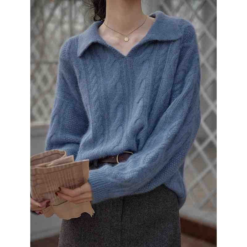 新款山羊绒复古麻花毛衣女不对称翻领针织开衫慵懒感外套秋冬上衣