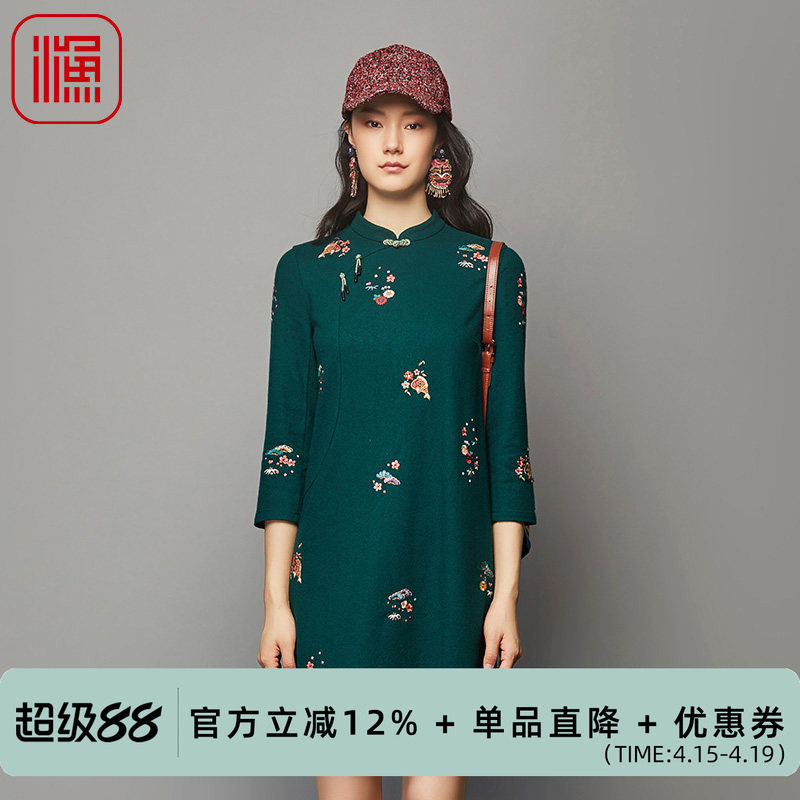 渔服饰裙子女秋冬季2023新款针织毛呢绣花改良旗袍连衣裙FGFD0040