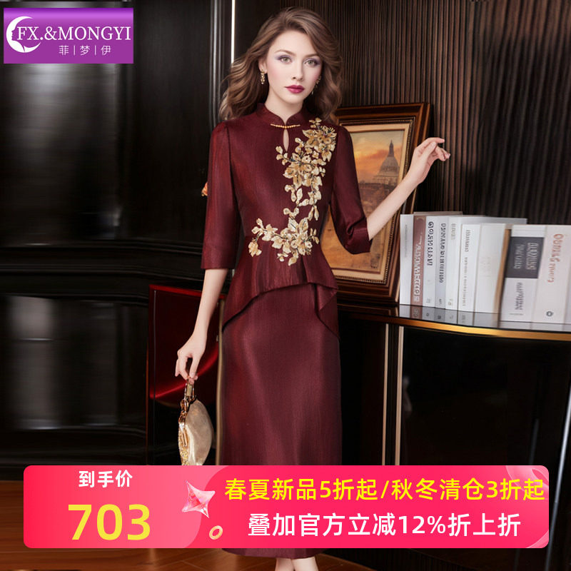 凤禧旗袍新款酒红色丝绒拼接气质高贵妈妈装婚宴礼服喜婆婆婚庆冬