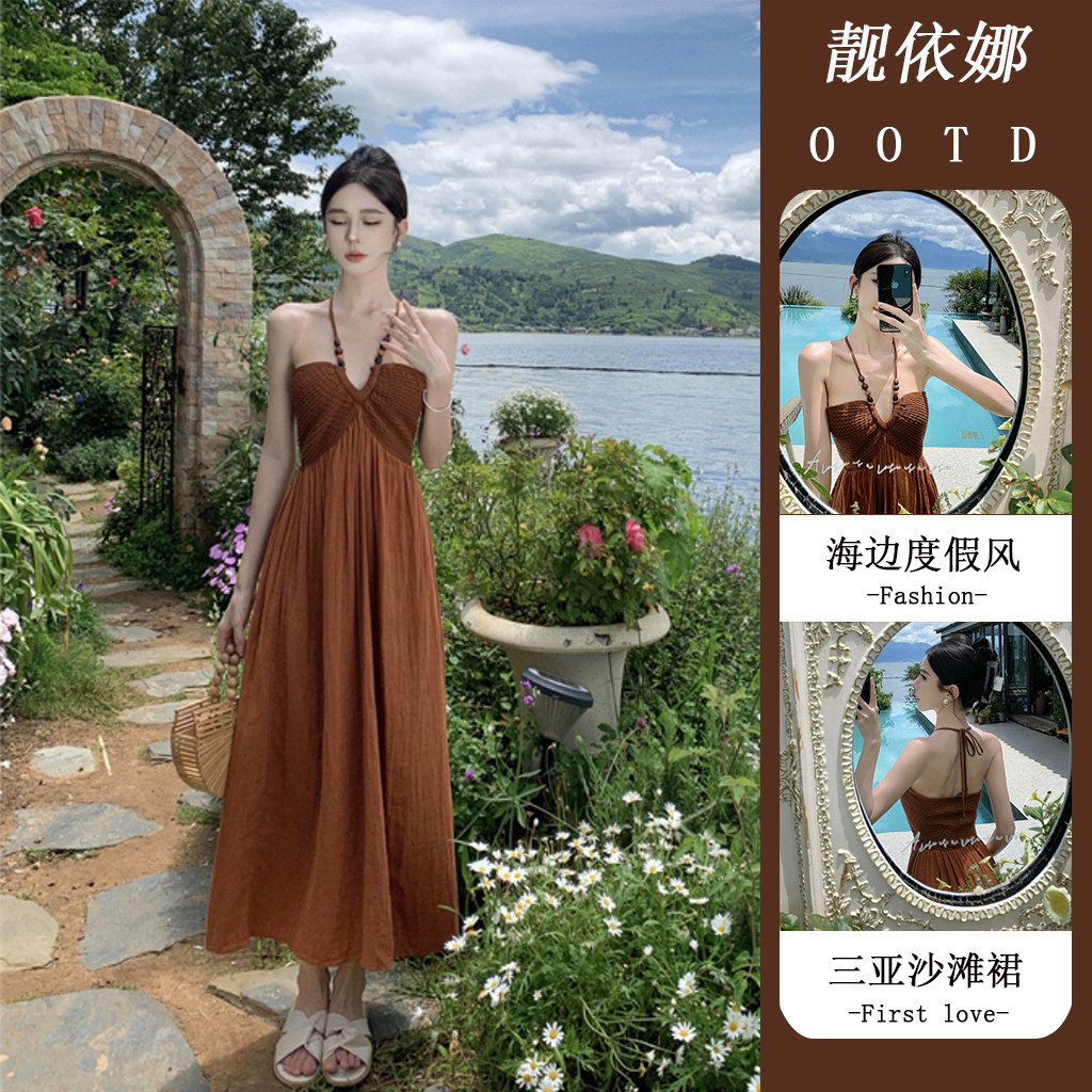 海南三亚旅游穿搭挂脖吊带连衣裙女夏季海边拍照片度假露背沙滩裙