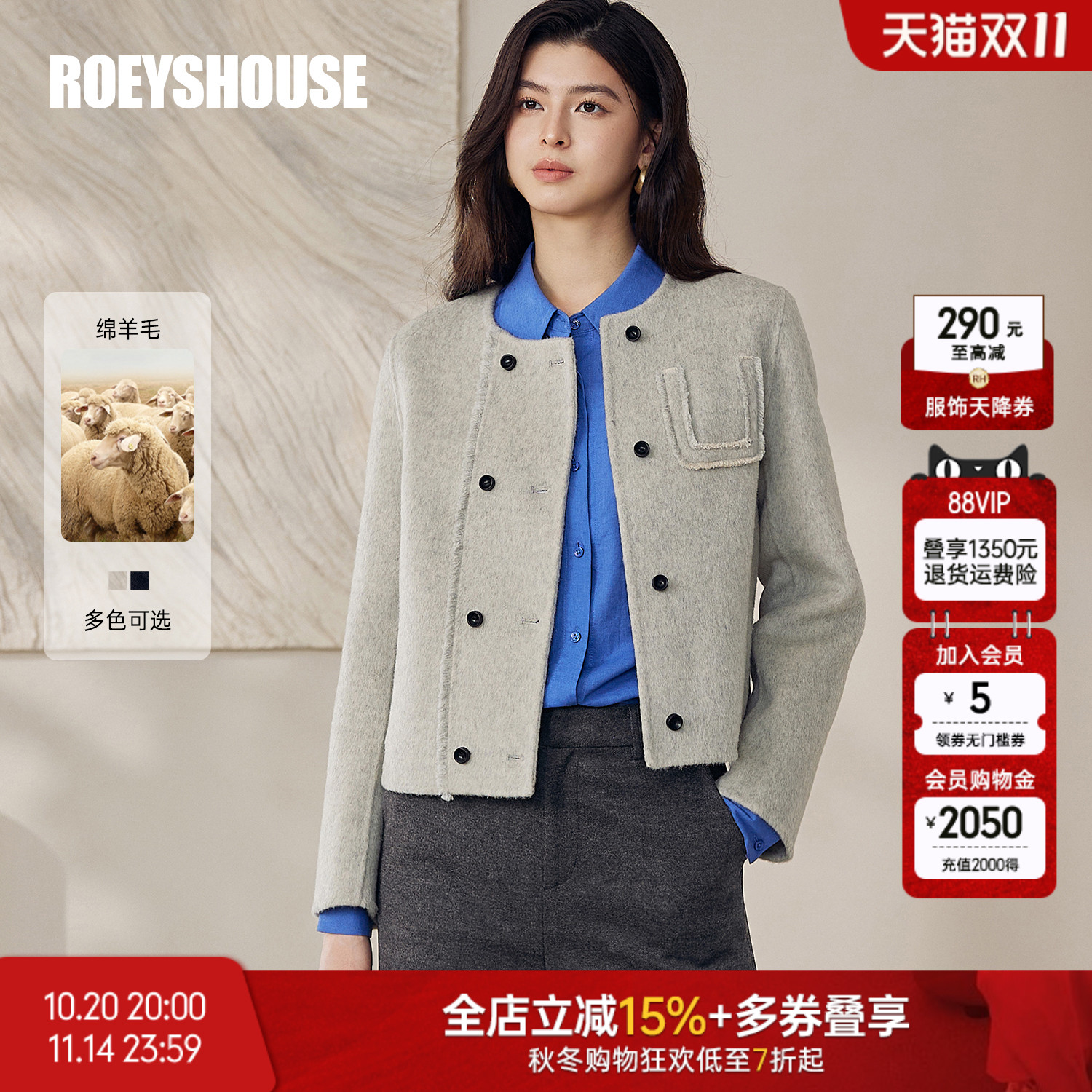 罗衣职场通勤灰色短款毛呢外套女秋冬箱型圆领双排扣短外套12923