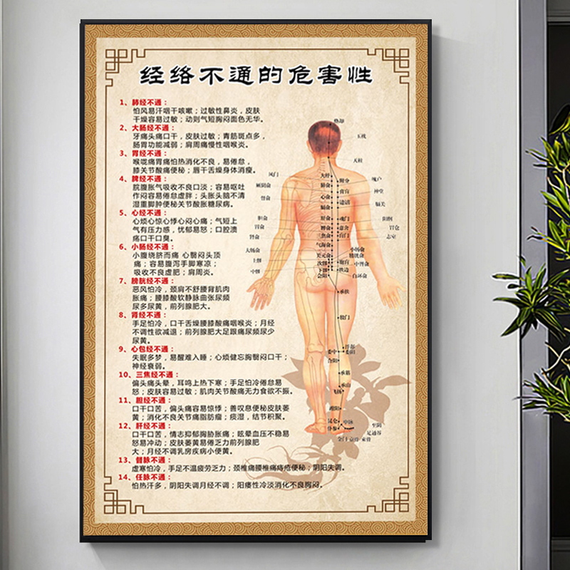中医养生理疗馆美容院宣传装饰画经络不通的危害性人体穴位图挂图