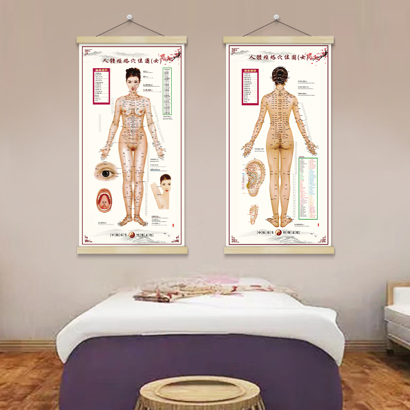 中医养生女性人体经络穴位图实木挂轴挂画卷轴画拔罐针灸按摩挂图