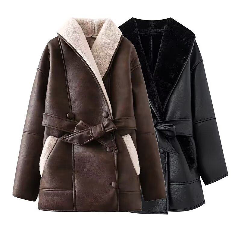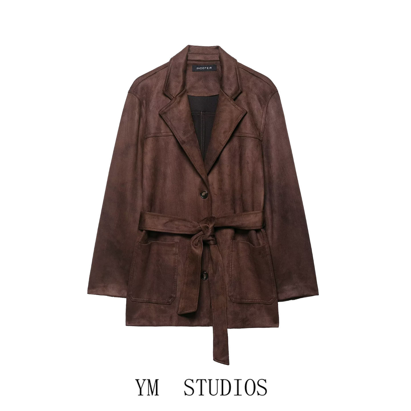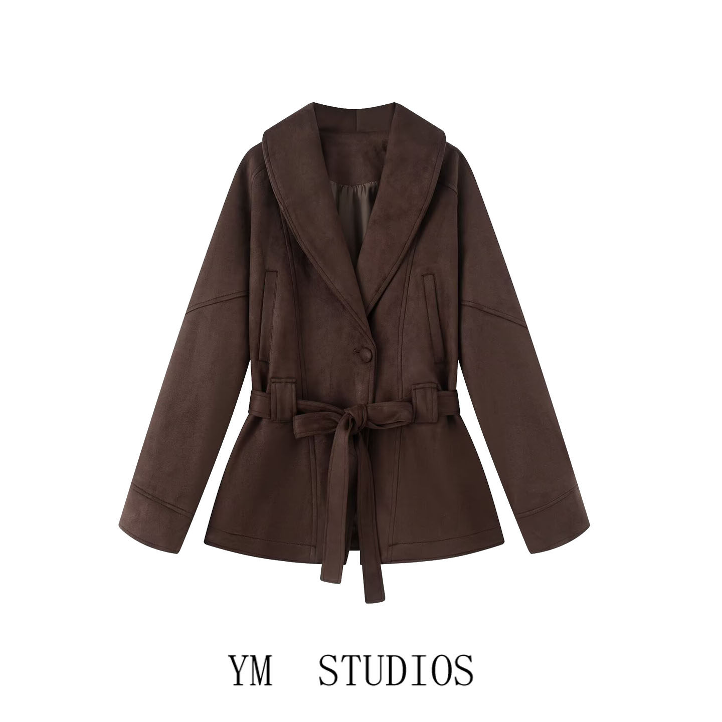 欧美女装 美拉德复古麂皮绒绒面效果系腰带外套女宽松机车风衣潮