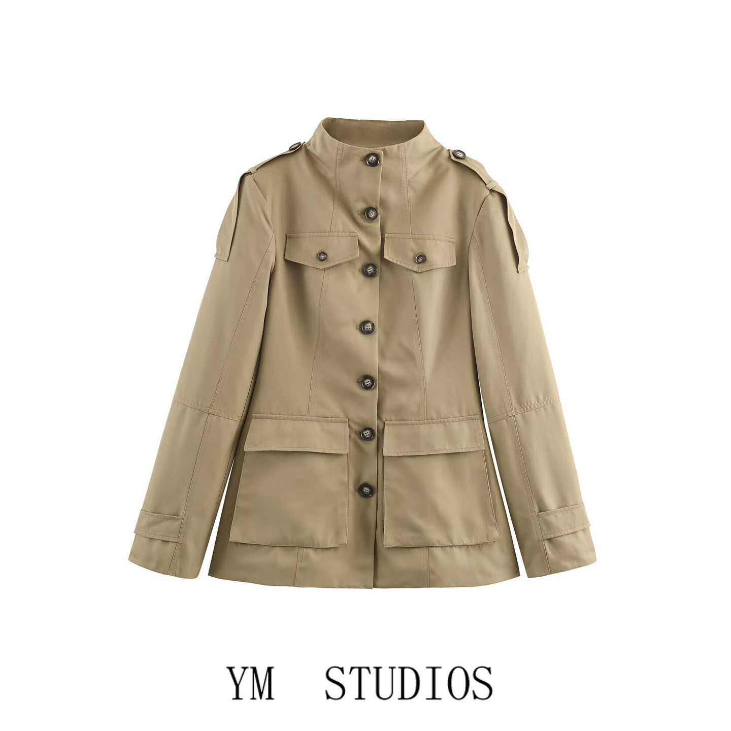 欧美女装 街头风立领多口袋卡其色风衣外套女2025新休闲时尚外套