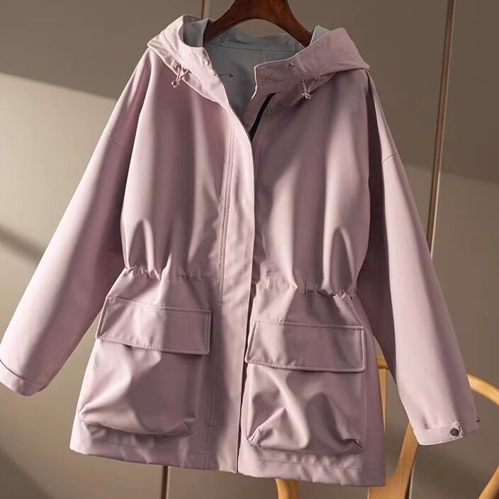 欧美原单 软壳防泼水连帽收腰显瘦简约春秋休闲中长款风衣外套女