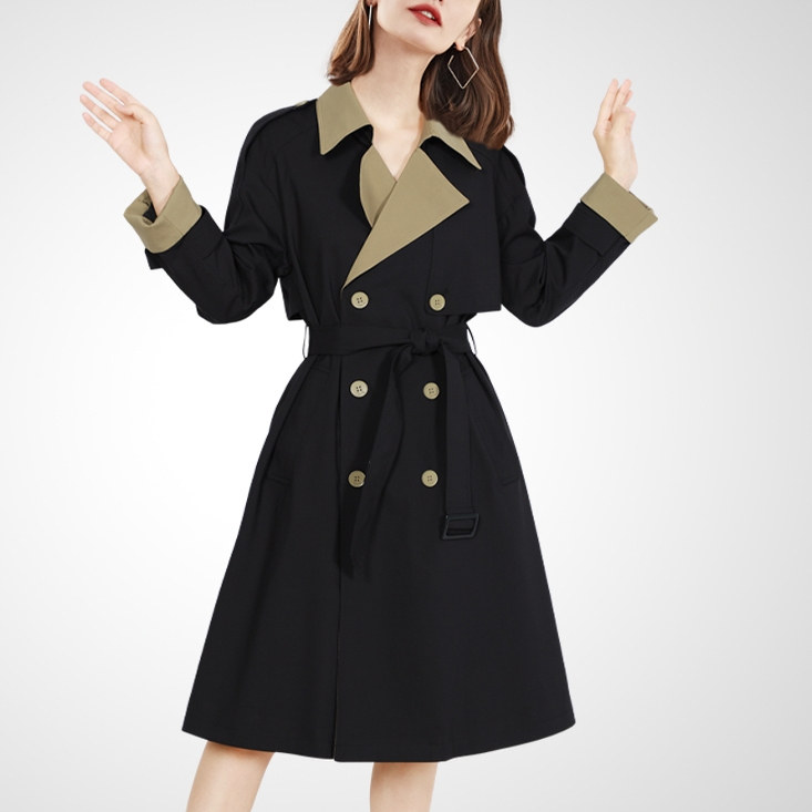 欧美全棉蕾丝拼接中长款休闲双排扣风衣外套 外贸原单女装春秋新