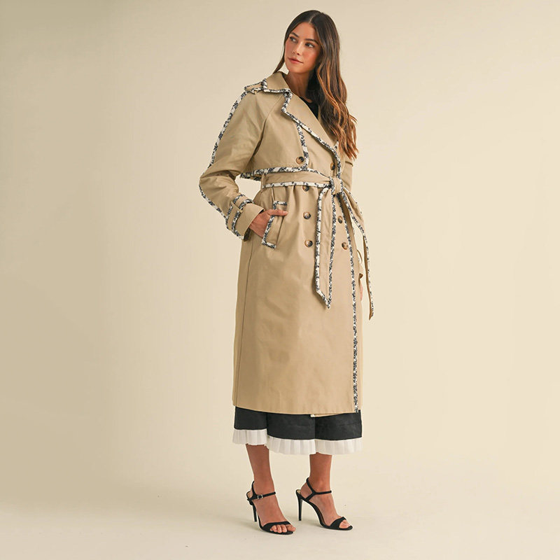 美国单M@ble小众设计款时尚粗花呢饰边双排扣长款风衣外套大衣女