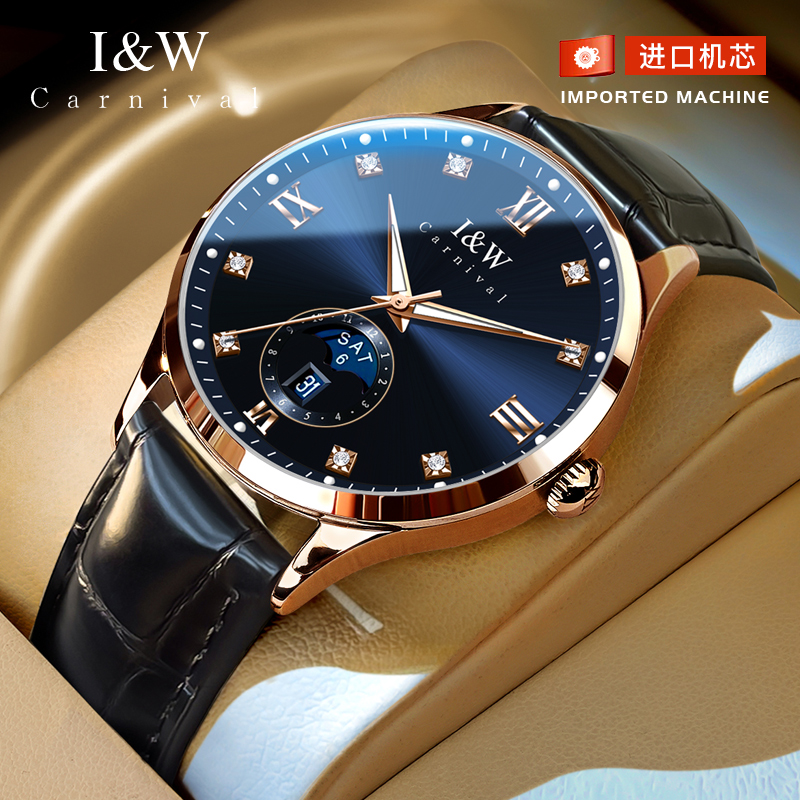 卡罗莱全自动机械表皮带男士手表品牌正品男表防水精钢带学生十大
