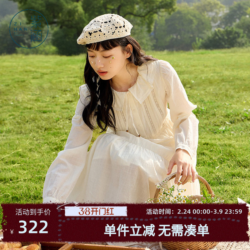 紫涵假两件娃娃领连衣裙女秋季新款甜美收腰显瘦长袖拼接a字短裙