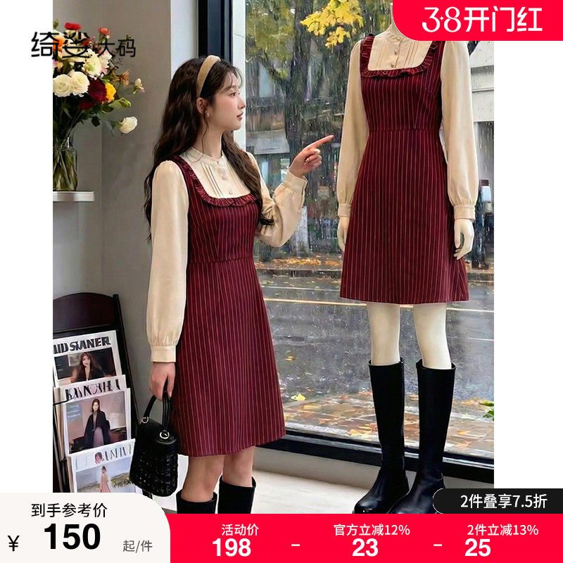 2026春装新款法式气质显瘦胖MM大码A字裙遮肉长袖条纹红色连衣裙