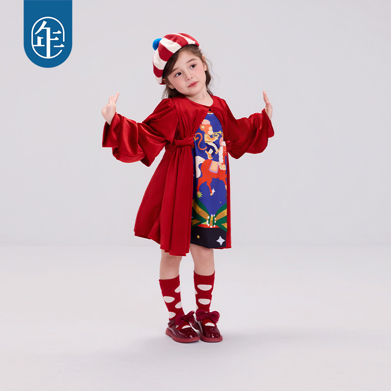 红色毛呢连衣裙25秋冬新款女童圣诞节长袖拜年服新年公主裙A字裙