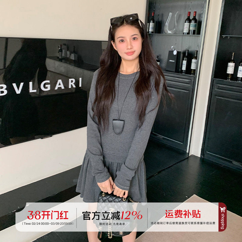 pusumede 法式气质长袖针织连衣裙女收腰显瘦a字圆领打底裙短裙子