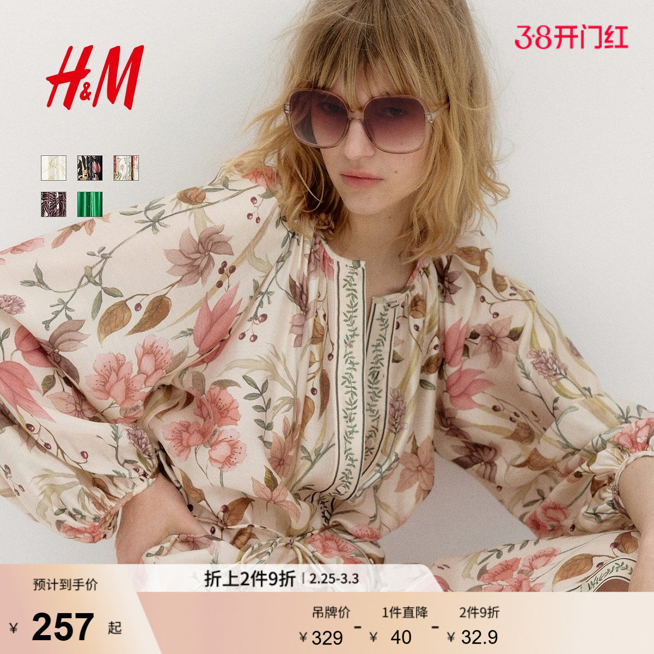 HM女装连衣裙春季缎面大摆裙插肩袖灯笼袖A字长袖连身裙1299908