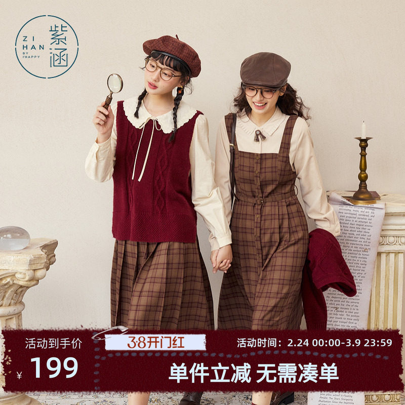 紫涵假两件格纹衬衫连衣裙女秋季新款休闲收腰显瘦长袖A字中长裙