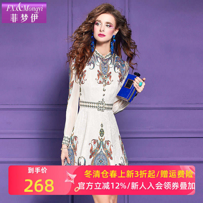 菲梦伊印花衬衫连衣裙女长袖秋装重工刺绣高端精致收腰气质A字裙