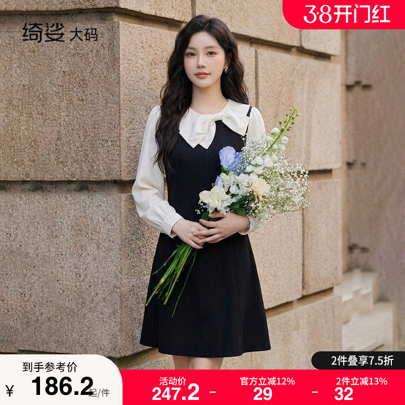 绮娑大码连衣裙2026春装新款娃娃领收腰显瘦胖MM长袖假两件A字裙