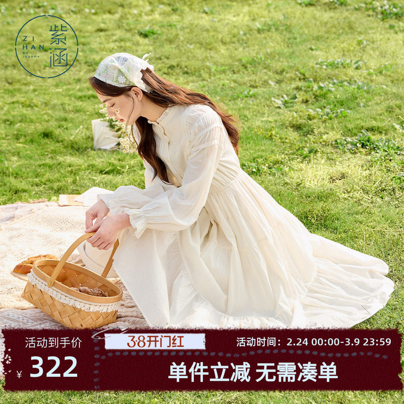 紫涵木耳领蕾丝长袖连衣裙女春秋季新款法式甜美休闲收腰a字裙子