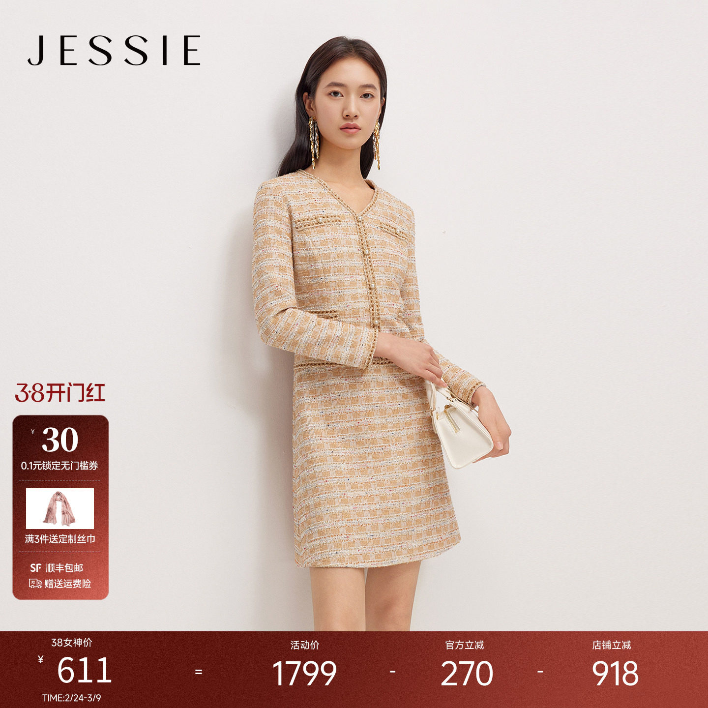 JESSIE小香风V领修身连衣裙女25年冬季新款收腰显瘦长袖短款A字裙