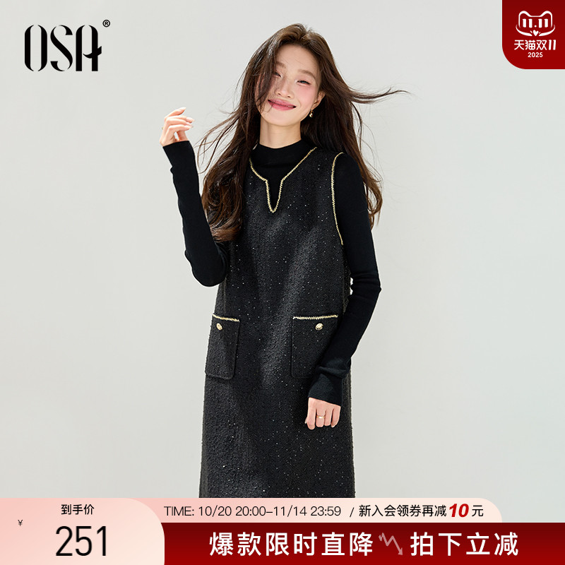 OSA欧莎黑色亮片毛呢v领背心裙女2025冬季新款小香风高级感连衣裙