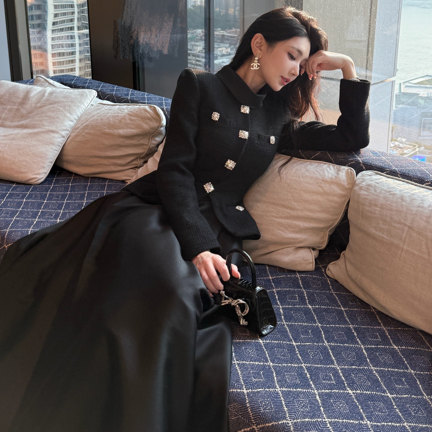 小香风毛呢背心裙重工钉珠小黑裙A字显瘦连衣裙 2025秋冬新款女装