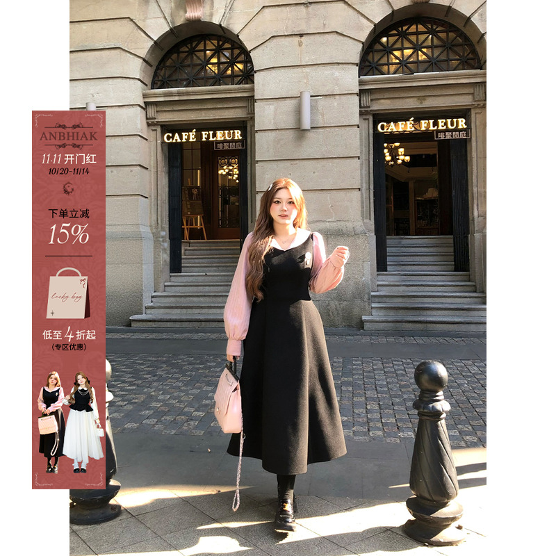 安妮不火 学院风烫钻细闪呢子料连衣裙女微胖大码假两件毛呢裙子
