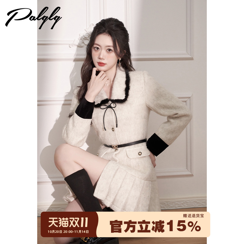 法式撞色小香风西装连衣裙女新款秋冬季重工显瘦娃娃领毛呢a字裙