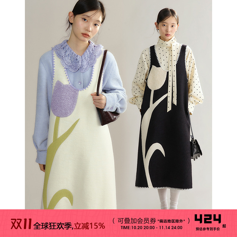 有耳uare原创设计 骄傲的郁金香 撞色拼接花朵含羊毛呢背心连衣裙