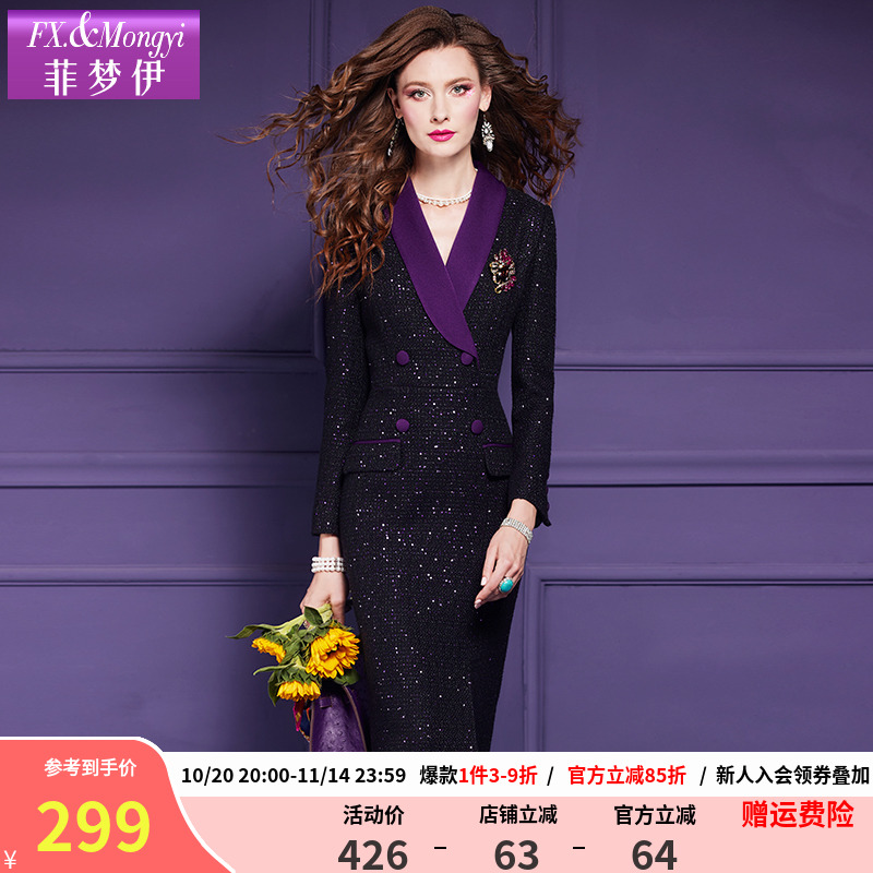 菲梦伊亮片粗花呢西装连衣裙女秋季高级感时尚气质双排扣毛呢裙子
