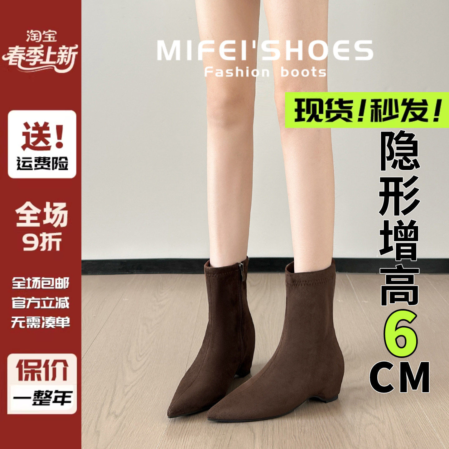 米霏~内增高6cm尖头短靴女2025冬季新款小个子裸靴粗跟绒面瘦瘦靴