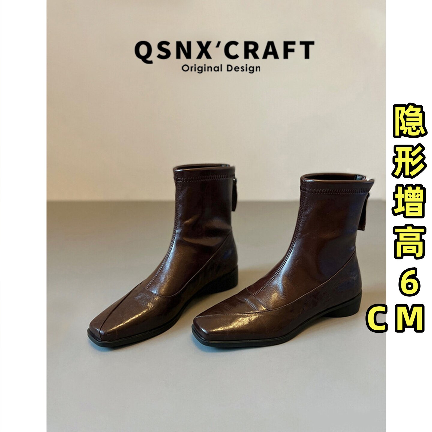 法式方头靴小个子内增高8CM瘦瘦靴女2026冬新款法式后拉链短靴子