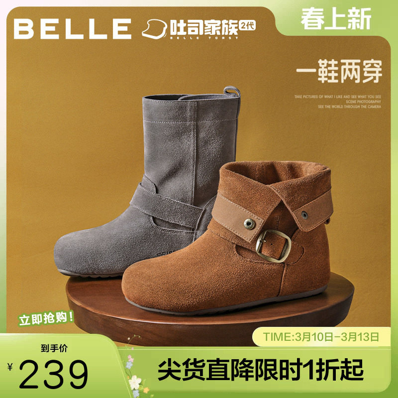 百丽女鞋复古吐司勃肯靴女冬季新款内增高西部堆堆短靴子E7X1DDZ5
