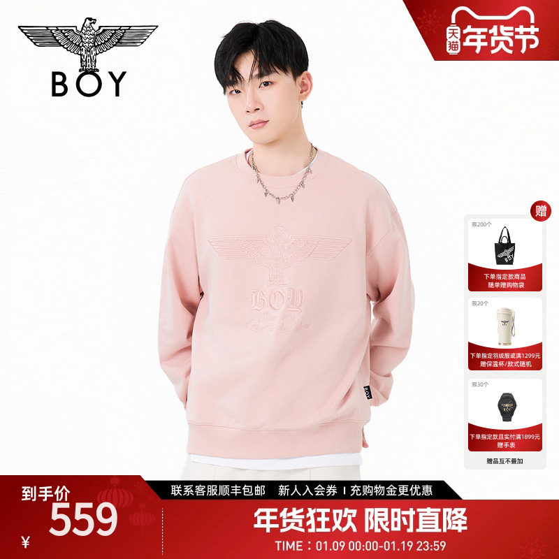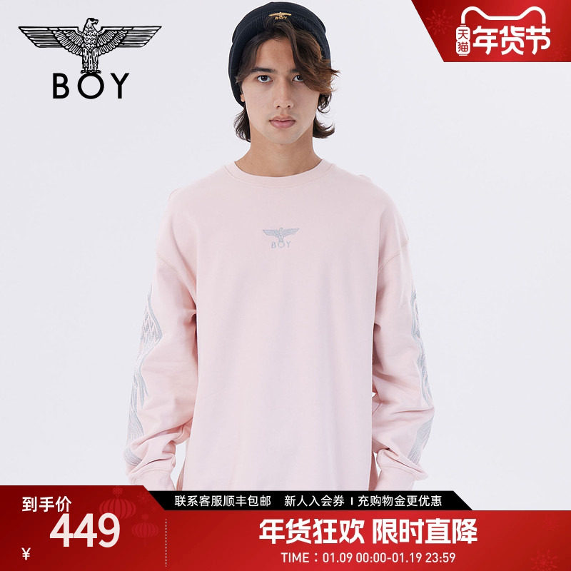 BOYLONDON春季男女同款粉色简约刺绣休闲潮牌圆领长袖卫衣N03804