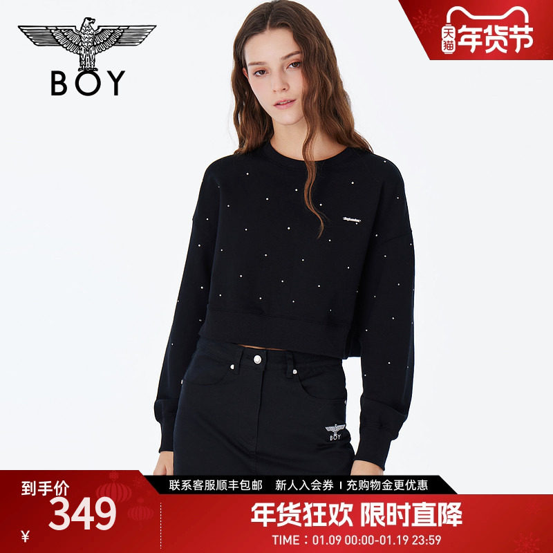 BOYLONDON春季女士短款上衣烫钻设计感圆领套头卫衣长袖W03001