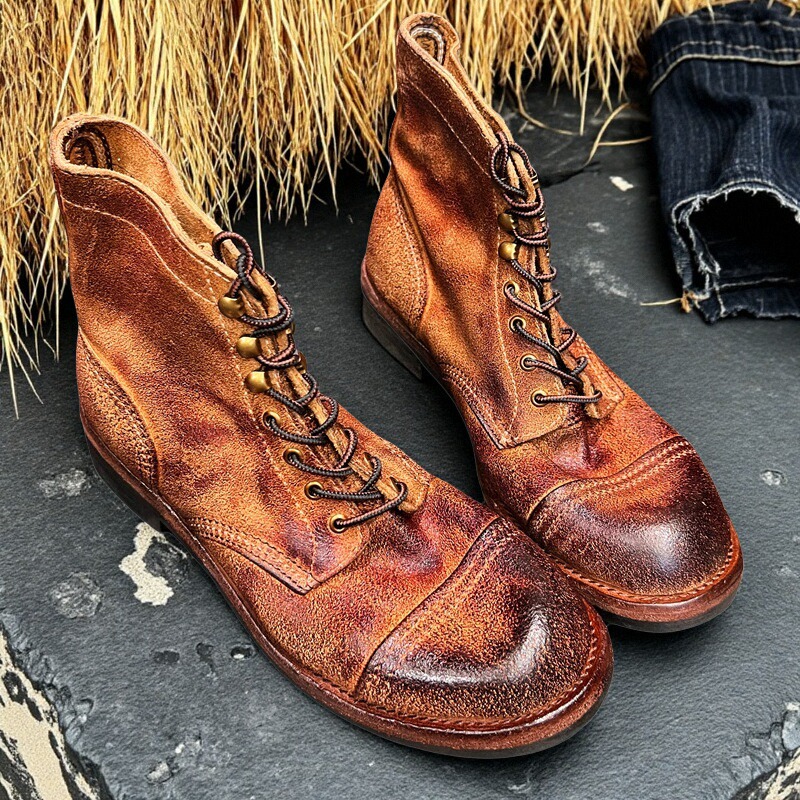 美式复古英伦风做旧纯牛皮靴男高帮工装机车鞋厚底真皮马丁短靴潮